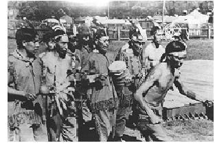 When war was threatened the warriors met at the national headquarters where they came under the command of the chief for warfare. During an emergency such as a threat of war, the red flag of war was raised. The flag was a long pole painted red which had red painted deerskin fastened to the top. During a war it was carried by a special flag warrior and was set up at the war party campsites where they met together after a battle. During these encampments they sang the song and then had the war dance.
